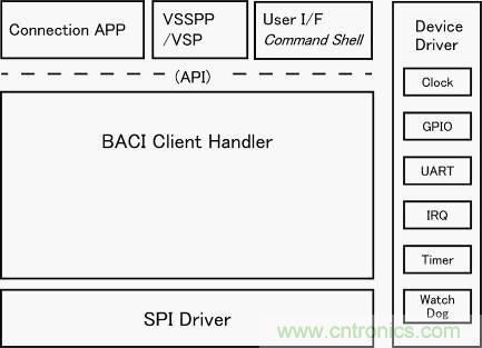 BACI通過簡化與主機之間的通信來降低訪問頻率。而且,在結(jié)構(gòu)設(shè)計上采用通過事件使主機啟動的結(jié)構(gòu),因此,是盡可能使主機停動來抑制耗電量的設(shè)計。綜上所述,本LSI在整個結(jié)構(gòu)模塊上進(jìn)行了降低耗電量的設(shè)計,從而,使紐扣電池驅(qū)動3年以上連續(xù)工作成為可能。主機和堆棧結(jié)構(gòu)如圖2所示。
