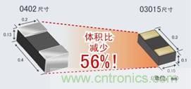 03015電阻器在量產(chǎn)的電子零部件中達到了最小型。相比以往的0402產(chǎn)品,成功地將尺寸降低了56%。