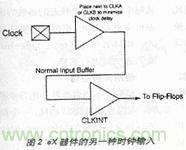 有時(shí)用戶很難阻止時(shí)鐘進(jìn)入器件。在此場(chǎng)合,用戶可使用與CLKA或CLKA相鄰的正常輸入引腳并在設(shè)計(jì)中加進(jìn)CLKINT。這樣,時(shí)鐘將通過靠近時(shí)鐘引腳的正常輸入進(jìn)入器件,再通過CLKINT向器件提供時(shí)鐘資源。