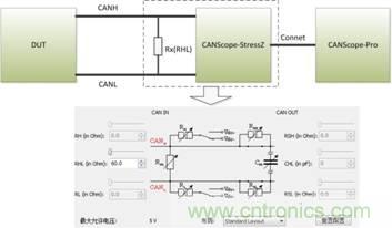 1. 如圖1所示,進行測試連接。測試使用CANScope-Pro的眼圖功能,進行統(tǒng)計以達到高的測試精度。DUT上電后,要一直發(fā)送CAN報文, CANScope不勾選總線應(yīng)答,其黑色表筆(地)要和DUT的CAN收發(fā)器共地。