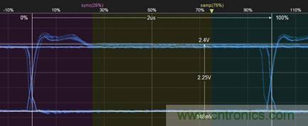 4. 然后再測量bit后半段的最大幅值,如圖5所示,為2.25V。則2.25÷2.15=104%,符合GMW3122信號特征標(biāo)準(zhǔn)。