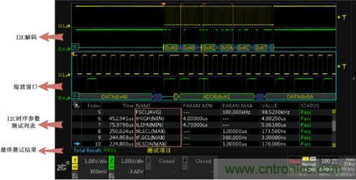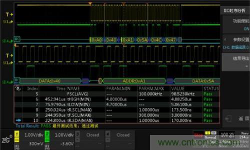 使用I2C時(shí)序分析軟件,它能夠在極短的時(shí)間內(nèi)完成總線信號(hào)的DC特性和AC特性分析,并與器件手冊(cè)標(biāo)稱參數(shù)做對(duì)比,直接輸出測(cè)試結(jié)果(Pass/Fail),同時(shí)支持報(bào)表導(dǎo)出,省去人工錄入數(shù)據(jù)的煩惱,極大的提升測(cè)試效率。具體測(cè)試界面如下圖4所示。