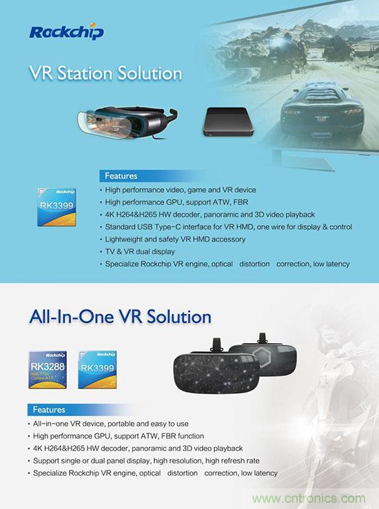 【導(dǎo)讀】本屆CES2017大展中VR全球產(chǎn)業(yè)熱度不減不增,全球硬件、平臺(tái)和內(nèi)容廠商蜂擁而至,Intel、NVIDIA、Qualcomm芯片商以及HTC、Oculus、SONY、三星、華為設(shè)備商均發(fā)布極具看點(diǎn)的新技術(shù)與旗艦機(jī)型。瑞芯微Rockchip本次展示了VR設(shè)備方案集群,方案從播放終端拓展至攝錄領(lǐng)域,成為VR新看點(diǎn)。