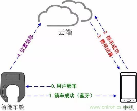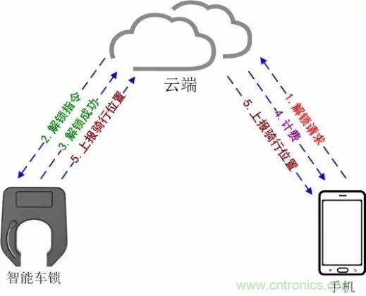 1.手機先掃單車上二維碼,而后向云端發(fā)起解鎖請求(請求中會攜帶掃碼單車的ID信息及用戶個人賬號信息)。云端對用戶信息、單車信息進行核查,而后將授權(quán)信息發(fā)送給手機。(步驟1、2)