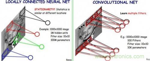 CNN中認(rèn)為同一層中的權(quán)重參數(shù)可以共享,因?yàn)橥粡垐D片的各個(gè)不同區(qū)域具有一定的相似性。這樣原本的全連接計(jì)算量過大問題就解決了,如下圖所示: