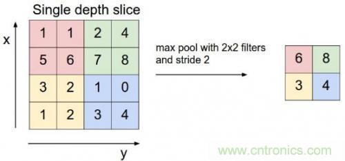 CNN中還有一個(gè)池化層,當(dāng)某一層輸出的數(shù)據(jù)量過大時(shí),通過池化層可以對(duì)數(shù)據(jù)降維,在保持住特征的情況下減少數(shù)據(jù)量,例如下面的4*4矩陣通過取最大值降維到2*2矩陣: