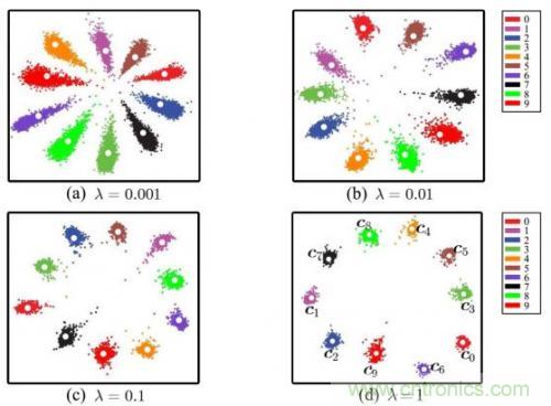以上只是通用的CNN網(wǎng)絡(luò),由于人臉識(shí)別應(yīng)用中不是直接分類,而是有一個(gè)注冊(cè)階段,需要把照片的特征值取出來(lái)。如果直接拿softmax分類前的數(shù)據(jù)作為特征值效果很不好,例如下圖是直接將全連接層的輸出轉(zhuǎn)化為二維向量,在二維平面上通過顏色表示分類的可視化表示: