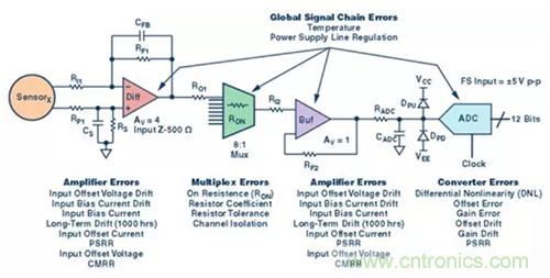 無(wú)源和有源器件都會(huì)出現(xiàn)多種誤差。并非所有誤差都很重要,但要記住對(duì)信號(hào)鏈應(yīng)用重要的那些誤差。并非所有誤差對(duì)每種應(yīng)用都有效。在進(jìn)行任何直流精度誤差分析時(shí),決定最重要或者影響最大或權(quán)重最大的誤差有哪些,這是必不可少的步驟。