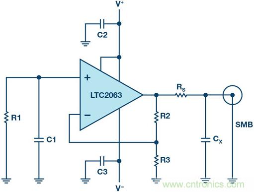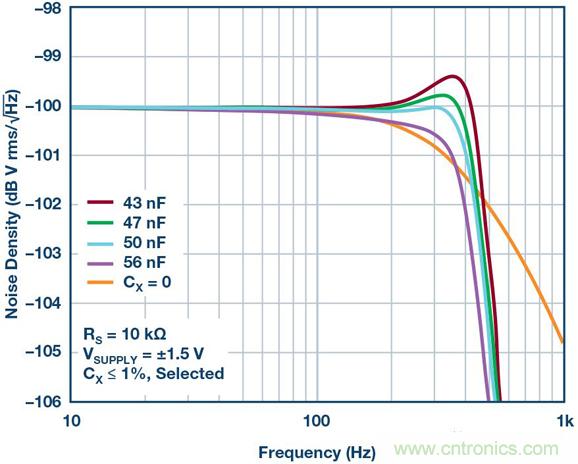 關(guān)鍵IC參數(shù)與運算放大器電源電流有關(guān),低電源電流的器件可能需要稍大的CX,而高電源電流的器件很可能需要小于30 nF的電容,同時實現(xiàn)更寬的平坦帶寬。