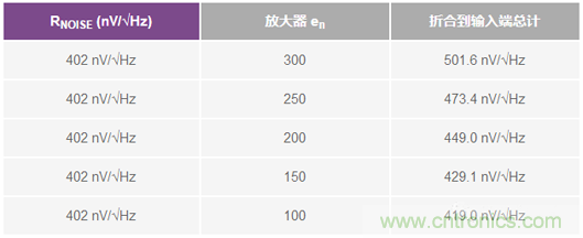 表2顯示了增加獨立信號源引起的噪聲增加。從402 nV/√Hz到502 nV/√Hz的變化按對數(shù)算只有1.9 dB,或0.96功率dB。運算放大器噪聲約為電阻噪聲的50%,運算放大器VNOISE的5%不確定性僅讓輸出噪聲密度改變1%。