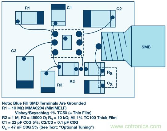 該原型使用帶聚酰亞胺絕緣層的小銅箔作為屏蔽層。此箔片或翼片纏繞在輸入元件(10 M + 22 pF)周圍,并焊接到PCB背面的接地端。改變翼片的位置對EMI靈敏度和低頻(LF)雜散風險有顯著影響。實驗表明,偶爾出現(xiàn)的低頻雜散是由EMI引起的,該雜散可通過非常好的屏蔽來防止。使用翼片,在沒有任何附加高導磁合金屏蔽的情況下,原型在實驗室中的響應(yīng)很干凈。頻譜分析儀上沒有出現(xiàn)主電源噪聲或其他雜散。如果信號上出現(xiàn)過多的噪聲,則可能需要額外的EMI屏蔽。