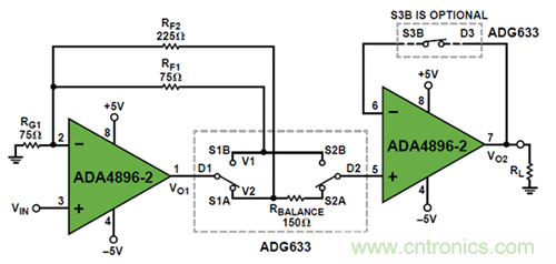 圖 1. 利用 ADA4896-2 和 ADG633 構(gòu)建低噪聲增益可選放大器來驅(qū)動(dòng)低阻負(fù)載