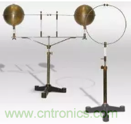 赫茲將兩個(gè)大的銅球作為電容,并通過銅棒連接在相隔很近的兩個(gè)小銅球上。兩個(gè)小銅球連出兩根