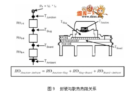 散熱設(shè)計是LED光源區(qū)別于傳統(tǒng)光源的課題之一。傳統(tǒng)燈具產(chǎn)生的熱遠(yuǎn)高于LED,但傳統(tǒng)燈具不會因為高溫而降低其光源輸出能力,但LED的光輸出卻會隨著本身接口(Junction,?。校谓涌冢囟鹊纳叨陆?,如圖8所示。而其產(chǎn)生的熱如何散除到外界環(huán)境與其封裝結(jié)構(gòu)材料息息相關(guān),牽涉到使用的散熱材料與相關(guān)外型,關(guān)系如圖9所示,其中熱阻的概念,代表輸入W功率時,需要提高多少K溫度才足以散熱。以現(xiàn)有的封裝技術(shù)最高可允許LED操作在185℃(Lumiled?。耍玻?,但一般因為封裝膠材的關(guān)系,可允許的操作溫度約在125℃,除了考慮光源輸出效率之外,亦考慮封裝膠材的變質(zhì)(樹脂類材料在高溫有老化現(xiàn)象)。