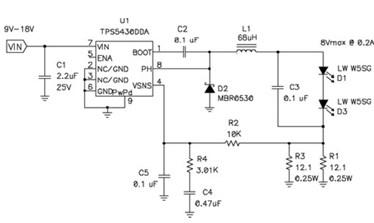 在輸出電壓始終小于輸入電壓的情況下,應使用降壓穩(wěn)壓器,圖5顯示了該拓撲結構。在該電路中,對電源開關的占空比 (duty factor) 進行了控制,以在輸出濾波器電感 L1 上確立平均電壓。當FET開關閉合時(TPS5430 內部),其將輸入電壓連接到電感器,并在L1中構建電流。D2為環(huán)流二極管 (catch diode),可提供開關斷開時的電流路徑。電感器可對流過LED的電流起到平滑的作用,該工作可通過用電阻監(jiān)控(測量)LED電流,并將電壓與控制芯片內部的參考電壓進行比較,最終進行調節(jié)。如果電流太低,則占空比增加,平均電壓也上升,從而也導致了電流的升高。該電路具有極佳的效率,因為電源開關、環(huán)流二極管以及電流感測電阻上的壓降非常低。