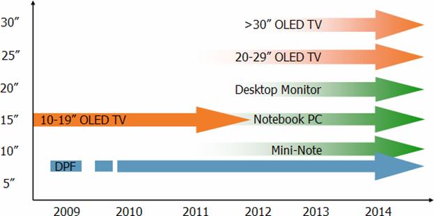 隨著技術(shù)進步,DisplaySearch預(yù)估AMOLED將進一步朝中大尺寸方向發(fā)展。筆記本計算機將是AMOLED廠商下一個關(guān)注的應(yīng)用方向,我們估計自2010年年中,廠商將有機會將AMOLED應(yīng)用在筆記本計算機上,而采用AMOLED面板上網(wǎng)本將有機會于2010年底開始量產(chǎn)。在TV方面,我們預(yù)期2010年底將會有大于20寸AMOLED TV被生產(chǎn),同時預(yù)期2011年大于30寸AMOLED TV 將會進入市場中。