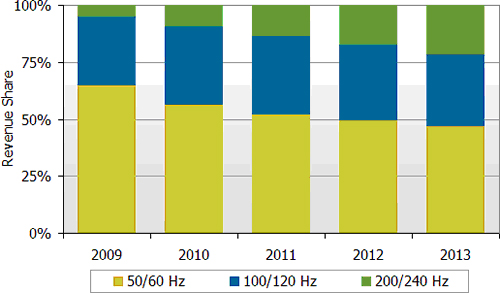 根據(jù)DisplaySearch最新一季全球電視出貨報(bào)告中指出,對(duì)液晶電視制造商而言,轉(zhuǎn)移并制造采用高倍頻技術(shù)電視以提高產(chǎn)品價(jià)值非常重要,而對(duì)零售商來(lái)說(shuō),提高液晶電視產(chǎn)品的便利性與高畫質(zhì)亦是重要課題。預(yù)計(jì)2009年120Hz液晶電視出貨金額將占全球液晶電視出貨總金額的31%,而240Hz 液晶電視將占5%;到了2013年,120Hz液晶電視出貨金額占全球液晶電視出貨總金額的比重將成長(zhǎng)到32%,而240Hz液晶電視將接近22%。