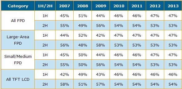 表一 2007-2013全球平面顯示產(chǎn)業(yè)上下半年市場份額