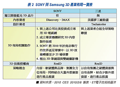 然而,消費(fèi)者要的不是一臺(tái)高科技電視,更要豐富的閱聽(tīng)內(nèi)容。以3D影像產(chǎn)業(yè)而言,除了需要強(qiáng)大硬體裝置支援外,其豐富的3D內(nèi)容支援也是相當(dāng)重要的。09年的CES展,許多大廠(chǎng)開(kāi)始拉攏平臺(tái)與內(nèi)容業(yè)者一同站臺(tái),因?yàn)樗麄冎拦馐侵挥杏搀w不能讓消費(fèi)者買(mǎi)單,多元的加值服務(wù)才是消費(fèi)性電子未來(lái)的趨勢(shì)。2010年的CES展,同樣也是依循前年的模式,而且力道更加強(qiáng)勁,以補(bǔ)強(qiáng)各自提出自有的硬體解決方案。另一方面,以SONY與三星來(lái)說(shuō),兩家公司同時(shí)都與RealD技術(shù)合作以獲取3D的專(zhuān)利技術(shù),以避免專(zhuān)利侵權(quán)的問(wèn)題發(fā)生,就以產(chǎn)業(yè)現(xiàn)況來(lái)看,頗有烘抬3D產(chǎn)業(yè)的味道(見(jiàn)表二)。