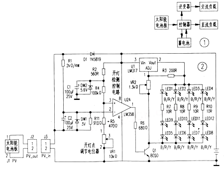 考慮到生產(chǎn)成本,電路中未設計蓄電池過充電控制電路。而蓄電池過放電控制原理則是充分利用了LED發(fā)光二極管的導通“勢壘”來實現(xiàn)的,雖未加蓄電池過放控制電路,同樣也能實現(xiàn)蓄電池的過放電保護功能。