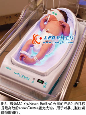所幸,光療通常對此種病癥有效果,因為膽紅素會吸收藍光,分解為水溶形式而排出體外(圖2)。458nm~462nm區(qū)域中的窄帶藍光最有效。過去,膽紅素治療光線都采用定制的藍色熒光燈管和彩色過濾器。但是,熒光燈的光譜相對較寬。盡管其分布中心位于所需波長上,但光譜分布在兩端下降,表示能破壞膽紅素的光能量下降,因此治療時間將延長。與之相比,藍光LED膽紅素光源可以有正確的頻率,幾乎不浪費光能量。另外,LED的膽紅素光源有機械穩(wěn)定特性,更長的壽命,也比熒光設(shè)備低廉。在未來,光線療法將能通過“發(fā)光服”提供光照,提供比光箱更有效的治療方法。