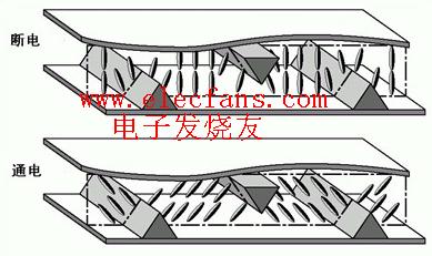 如圖是一種雙疇VA模式液晶。未加電時,液晶分子長軸垂直於螢?zāi)唬挥性?近凸起物電極的液晶分子略有傾斜,光線此時無法穿過上下兩片偏光板。當(dāng)加電後,凸起物附近的液晶分子迅速帶動其他液晶轉(zhuǎn)動到垂直於凸起物表面狀態(tài),即分子長軸傾斜於螢?zāi)?,透射率上升從而?shí)現(xiàn)調(diào)制光線。在這種雙疇模式中相鄰的疇分子狀態(tài)正好對稱,長軸指向不同的方向,VA模式就是利用這種不同的分子長軸指向來實(shí)現(xiàn)光學(xué)補(bǔ)償。如圖,在B處看到的是中灰階,在A和C處能同時看到的高灰階和低灰階,混色後正好是中灰階。