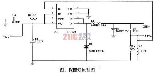 FP7102芯片設(shè)計(jì)的小型探照燈,所有元器件安放在1×2.7cm的板子上,制作完成后整個(gè)燈可以塞進(jìn)直徑為3cm的管子里,管子長(zhǎng)度可以任意長(zhǎng)。為了達(dá)到應(yīng)用板小型化,在此設(shè)計(jì)中使用FP7102芯片作為L(zhǎng)ED的驅(qū)動(dòng)芯片,電路可靠度高、元件使用精簡(jiǎn)、整體高效能運(yùn)作,在應(yīng)用上有很大的彈性空間,可滿足各種功率LED需要。
