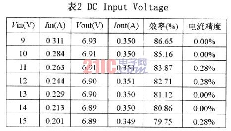 表2為輸入用直流電源,電壓范圍9~15V,從表中可以看出Iout幾乎不因輸入電壓不同而變動(dòng),效率為79.75~86.65%,電流精確度0.00~0.28%。(表2的數(shù)值是用1WLED量測(cè))