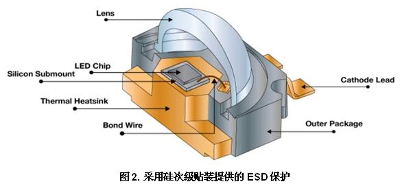 圖2顯示了如何在LED和引線框之間應用硅次級貼裝來更緊密地集成ESD保護。這種構造使LED外形尺寸更緊湊;次級貼裝替代側面貼裝LED模塊中使用的傳統(tǒng)襯底,提供的ESD保護等級超過15 kV HBM。硅次級貼裝的良好熱傳導性也幫助LED緩解由于LED與引線框熱膨脹系數(shù)不同導致的應力。