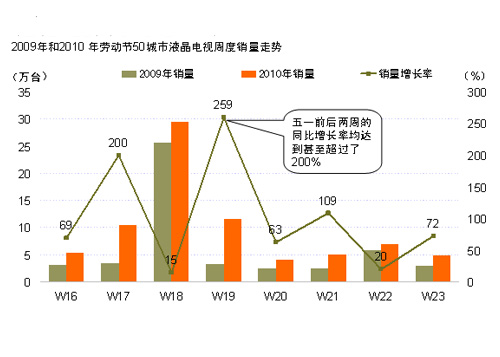 剛剛過(guò)去的五月,讓我們對(duì)于旺季銷售有了一個(gè)新的認(rèn)識(shí)。根據(jù)捷孚凱(GfK 中國(guó)) 50城市液晶電視周度監(jiān)測(cè)報(bào)告顯示,今年的勞動(dòng)節(jié)前后三周(第16、17和第19周)的銷量較去年同期有大幅增長(zhǎng),甚至遠(yuǎn)遠(yuǎn)大于勞動(dòng)節(jié)(第18周)的增長(zhǎng)率。從銷量的分布上來(lái)看,勞動(dòng)節(jié)前后三周的銷量之和已經(jīng)超過(guò)了節(jié)日當(dāng)周的銷量,而在以往,由于旺季促銷因素,消費(fèi)非常集中,特別是節(jié)后的銷量會(huì)迅速跌至谷底,就如去年勞動(dòng)節(jié),前后三周之和甚至不及節(jié)日當(dāng)周的一半?;仡櫼酝膰?guó)慶和勞動(dòng)節(jié)旺季莫不如此。今年的勞動(dòng)節(jié)市場(chǎng)徹底打破了這一傳統(tǒng)。