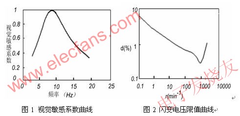 可以被人眼感知的光源閃爍,可以通過統(tǒng)計的方法來測得人眼的對光源閃爍的感覺特性。圖1是人眼對不同頻率的電壓波動引起的視覺敏感系數曲線。從曲線上可以看出最敏感的頻率是8.8Hz,偏離該頻率后,敏感度隨頻率而降低。當閃爍頻率40Hz以上時,感覺就不靈敏;50Hz以上的閃爍就完全沒有感覺。