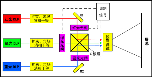 以投影方式為激光顯示解決方案的工作原理如圖1.1所示:紅、綠、藍(lán)三色激光分別經(jīng)過擴(kuò)束、勻場、消相干后入射到相對(duì)應(yīng)的光閥上,光閥上加有圖像調(diào)制信號(hào),經(jīng)調(diào)制后的三色激光由X棱鏡合色后入射到投影物鏡,最后經(jīng)投影物鏡投射到屏幕,得到激光顯示圖像。