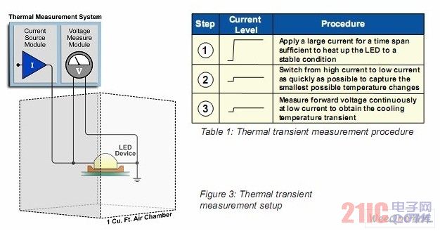 圖3描繪了此類測(cè)量裝置的簡(jiǎn)圖(不成比例)。測(cè)量的第一步是確定前向電壓在一個(gè)非常小的電流下的溫度敏感性,這個(gè)小電流可以是傳感器或測(cè)量電流。之后,LED被施加一個(gè)大電流,從而使其變熱。接著停止施加大電流,并且很小的傳感器電流再次出現(xiàn),同時(shí)用一個(gè)高采樣率完成前向電壓的測(cè)量,直至LED結(jié)溫完全趨于穩(wěn)定。由于LED快速的熱響應(yīng),所以測(cè)量的硬件設(shè)備必須能夠捕捉LED電流停止施加后幾微秒內(nèi)的溫度(電壓)改變。如圖3所示,被測(cè)量的LED處于一個(gè)封閉空間內(nèi),這個(gè)封閉空間是JEDEC標(biāo)準(zhǔn)的自然對(duì)流腔,它提供了一個(gè)沒(méi)有氣流流通的環(huán)境。T3STer也可以提供類似的裝置。表格1歸納了測(cè)試步驟。