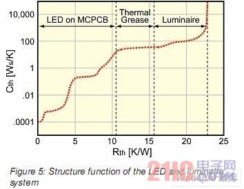 在圖5中,最初的曲線非常陡峭,同時(shí)熱容被加熱。這個(gè)曲線進(jìn)行了注解,描述了LED/MCPCB,封固劑(導(dǎo)熱硅脂)和照明設(shè)備三個(gè)階段。但在第一個(gè)階段內(nèi),曲線描述了更小的一些階段,譬如Dieattach,散熱板,甚至是緊固銅散熱板和MCPCB的膠水。注意這個(gè)圖形證實(shí)了早期的一個(gè)論點(diǎn),那就是LED自身的熱阻占整個(gè)系統(tǒng)結(jié)點(diǎn)至環(huán)境熱阻的50%。