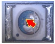 2. 變色:這類失效是指LED不點(diǎn)亮的狀況下,外觀顏色或膠材透明度與新品不同,用肉眼即可看出,通常在產(chǎn)品使用一段時(shí)間或在做完可靠度試驗(yàn)后發(fā)生。一般說(shuō)來(lái),變色區(qū)域大致可區(qū)分為發(fā)生在導(dǎo)線架或封裝膠材兩類,若發(fā)生在導(dǎo)線架,通常是因?yàn)楸砻媾c環(huán)境中的化學(xué)物質(zhì)發(fā)生反應(yīng),如氧化或硫化,要分辨屬于哪種需仰賴成份分析,可使用的儀器包含有EDS(Energy Dispersive X-ray Spectroscope)、XPS(X-ray Photoelectron Spectrometer)、AES(Augur Electron Spectroscope)等等。若是封裝用的膠材發(fā)生變色,則屬于高分子材料的劣化現(xiàn)象,如環(huán)氧樹脂易受高溫或是紫外光影響而變黃,因此白光LED多改采矽膠取代之。分析此類失效應(yīng)特別留意,因膠材本身有一定的透明度,有時(shí)變色的導(dǎo)線架因被膠材蓋住而誤判為膠材變色,引導(dǎo)至錯(cuò)誤的改善方向。