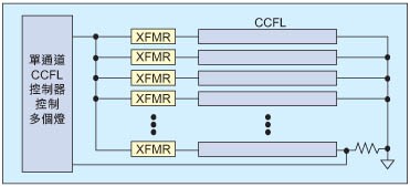 CCFL已在筆記型電腦、數(shù)位相機(jī)、導(dǎo)航系統(tǒng)以及其他具有較小LCD螢?zāi)坏脑O(shè)備中使用多年。這些類型的設(shè)備通常只用一個(gè)CCFL,因此,傳統(tǒng)設(shè)計(jì)只用一個(gè)CCFL控制器。隨著大尺寸LCD面板的出現(xiàn),帶來(lái)對(duì)多CCFL的需求,有必要采用新的方式來(lái)應(yīng)對(duì)這種新的需求??赡艿姆绞街皇遣捎靡粋€(gè)單通道CCFL控制器來(lái)驅(qū)動(dòng)多個(gè)燈(圖5)。這種方式中,CCFL控制器只透過(guò)其中的一個(gè)燈來(lái)監(jiān)測(cè)燈電流,而以幾乎相同的交流波形同時(shí)驅(qū)動(dòng)所有并聯(lián)的燈。然而,這種方式存在著幾個(gè)缺陷。