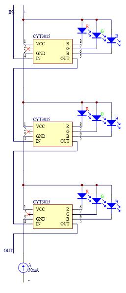 根據(jù)CYT3005單線傳輸驅(qū)動全彩LED燈設計圖,我們可以看出,單總線傳輸設計上顯得很簡單,這也是工程上最需要的傳輸方式。