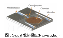 除了熱界面外,主動散熱系統(tǒng)已越來越受企業(yè)的歡迎。圖3給出了SynJet主動散熱模塊,它可以產(chǎn)生脈動空氣,從而可以把LED燈內(nèi)部的熱直接帶到外面。據(jù)了解,SynJet技術可以幫助設計師解決一些產(chǎn)品的散熱問題,如電腦產(chǎn)品,特別是高可靠性的LED產(chǎn)品。該技術有高散熱效率、低噪音、高可靠性和低功耗等優(yōu)點。