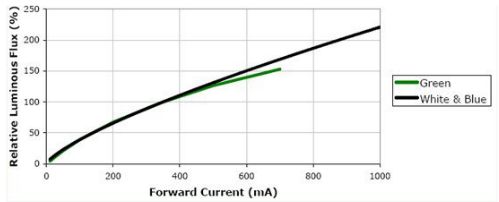 由圖中可以看到,如果正向電流從350mA降低8.75倍到40mA,其相對(duì)發(fā)光強(qiáng)度將從100降低到20。降低將近5倍。顯然這是完全不能允許的。所以一定要把電流恒定。