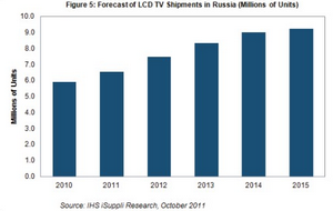 據(jù)IHS iSuppli公司的電視研究報告,隨著青睞先進電視技術(shù)的中產(chǎn)階級不斷壯大,今年俄羅斯液晶電視出貨量預(yù)計強勁增長10%。俄羅斯屬于所謂的金磚國家(BRIC),是一個重要市場。