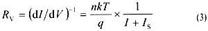 視頻電阻是伏安特性曲線在原點(diǎn)及其附近的斜率,它反映了勢(shì)壘高度的相對(duì)變化,決定著在零偏置或一定偏置條件下低電平射頻到直流的功率轉(zhuǎn)換效率。它可由肖特基勢(shì)壘二極管的伏安特性來(lái)表示[1]