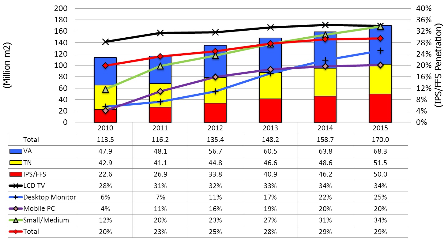 在液晶電視市場,廣視角一直是主要的賣點之一,其中IPS/FFS LCD面板的滲透率在2011年達(dá)到31%。在桌上型顯示器市場, IPS/FFS 面板傅統(tǒng)上被用在一些特殊應(yīng)用,例如醫(yī)療設(shè)備,2011年滲透率為7%,而NPD DisplaySearch預(yù)測這個數(shù)字在2015年將上升到25%,主因于IPS面板的領(lǐng)導(dǎo)生產(chǎn)商LG Display計劃使IPS成為桌上型顯示器面板的標(biāo)準(zhǔn)。