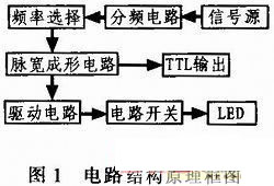 對水下成像系統(tǒng)而言,光源的選擇至關重要,光源的穩(wěn)定性、均勻性、響應速度及其光波波長范圍是系統(tǒng)成像的關鍵。采用藍光LED所發(fā)出光光經過水介質——目標反射——水介質——接收光學系統(tǒng),最終在成像傳感器(CCD,ICCD)上成像。這就決定了LED必須工作在快脈沖驅動方式下,目前市場上的驅動電路一般均丁作在慢脈沖驅動模式(μs量級),遠不能滿足我們的要求。因此,我們必須自己解決快脈沖驅動電路這一難題,尤其是實現(xiàn)以ns量級的大功率快脈沖來驅動大功率的LED?;谶@種實驗實際需求,我們研究開發(fā)了此種快脈沖驅動電路。該電路的基本功能是產生低頻、快速、大功率驅動電流脈沖信號,輸出脈沖的頻率與周期精確度高,穩(wěn)定性好,脈沖信號寬度在20~100 ns內分5檔可調,輸出在50 Hz的基準頻率下工作。脈沖信號通過驅動電路,輸出一個快脈沖信號驅動輸出電流開關,產生一個大電流脈沖信號驅動一個大功率LED。為了達到設計要求和目的,我們采用晶振電路產生高精度頻率/周期基準脈沖作為內置信號源,通過對基準脈沖進行多次分頻,產生所需頻率的輸出脈沖信號,這樣可以獲得頻率穩(wěn)定的脈沖信號,同時實現(xiàn)了頻率選擇。經過分頻后的脈沖信號再經過脈沖寬度成形電路實現(xiàn)脈寬調節(jié),然后經過電流開關電路,產生大電流脈沖,使LED發(fā)光。該驅動電路主要由以下幾個部分組成:信號源、分頻電路、頻率選擇、脈沖寬度電路、TTL輸出、驅動電路和電流開關電路。其框圖如圖1所示。