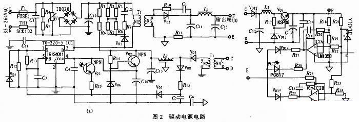 基于IRIS4011的電路由輸入保護電路,EMI抑制電路,輸入整流濾波電路,直流變換電路,輸出濾波電路,輔助供電電路,二次恒壓/恒流反饋電路組成。輸入電壓:85~264 VAC;輸入頻率47~63 Hz;輸出電壓5~24 VDC;輸出電流2.5 A;恒流精度±2.5%;最大輸出功率:60 W。利用變壓器的電感與瓷片電容實現(xiàn)準諧振工作模式,電路簡單,可靠性高。準諧振控制模式,能提高電路的轉換效率,降低EMI干擾。用放大器來實現(xiàn)恒壓、恒流控制,可以得到很高的控制精度。在輸出電流比較大的電路中,必須用放大器控制形式才能提高控制精度與提高電路轉換效率。限于篇幅,把電路圖分成2部分,具體的電路如圖2所示。