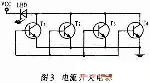 通過成形電路的信號,控制大功率藍光LED發(fā)光,驅動信號控制電流開關。電流開關選用一種大功率高頻三極管,為了滿足LED驅動電流的需求,將4只三極管并聯(lián),使流過LED的脈沖電流最大達到2.5 A,保證了LED在額定功率下工作,達到穩(wěn)定光源的目的。在輸入驅動信號的作用下,三極管進入導通狀態(tài),LED兩端產生一定的壓降,大電流流過LED,使大功率藍光LED發(fā)光,作為距離選通水下成像系統(tǒng)的光源,電路如圖3所示。