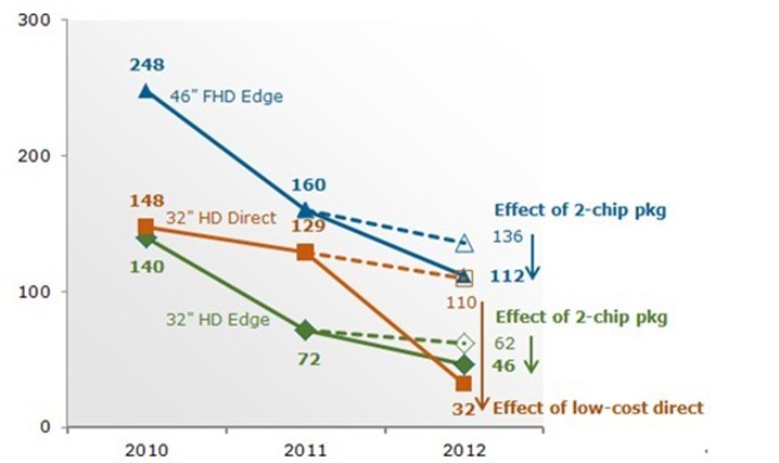 直下式LED背光源電視的材料成本與CCFL背光源的材料成本接近。NPD DisplaySearch預估以32寸液晶電視來說,直下式LED背光源的成本為CCFL背光源的1.3-1.4倍,而側(cè)光式LED背光源估計成本則超過CCFL背光源的兩倍。以40寸液晶電視來說,成本節(jié)省更顯著,低價直下式背光源材料成本減少近40元美金,而終端產(chǎn)品成本節(jié)省更可以達100美金。