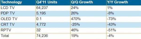 2011年第四季全球電視出貨量較去年同期下降4%,為7千420萬臺(tái)。液晶電視出貨量僅上升1%,為2004年以來最低;等離子電視下降了8%,CRT電視下降了43%。日本和西歐市場降幅最大,北美也僅維持少量增長,第四季度三個(gè)地區(qū)的電視總出貨量較去年同期下降了21%。新興市場電視出貨持續(xù)成長,增幅為12%,其中液晶電視出貨成長了20%。
