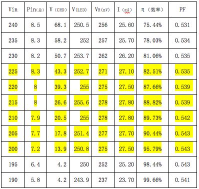 下面舉一個實測的結(jié)果為例,這是一個80顆3014串聯(lián)的球泡燈,采用了5顆Semitek 的S-562T并聯(lián)。它在不同的輸入市電電壓時,所測得的結(jié)果如下表所示。