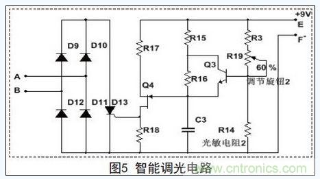 當(dāng)LED照明設(shè)備開始工作后,本文設(shè)計(jì)的智能開關(guān)會(huì)依據(jù)環(huán)境照明情況的變化,通過(guò)智能調(diào)光電路自動(dòng)地改變照明設(shè)備的亮度。圖1所示的智能調(diào)光電路接口A、B接入的電路如圖5所示。