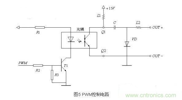 限于篇幅有限,下面僅對(duì)此PWM控制電路進(jìn)行簡(jiǎn)單的介紹:當(dāng)PWM控制信號(hào)為低電平時(shí),晶體管T1處于截止?fàn)顟B(tài),光電耦合器中發(fā)光二極管的電流近似為零,輸出端Q1和Q2間的電阻很大,相當(dāng)于開(kāi)關(guān)“斷開(kāi)”;當(dāng)PWM波控制信號(hào)為高電平時(shí),晶體管T1處于導(dǎo)通狀態(tài),光電耦合器中發(fā)光二極管發(fā)光,輸出端Q1和Q2間的電阻很小,相當(dāng)于開(kāi)關(guān)“導(dǎo)通”.由上面介紹可知,當(dāng)DS18B20采集的實(shí)時(shí)溫度小于制冷啟動(dòng)溫度時(shí),光電耦合器的PWM輸入端無(wú)信號(hào)輸入時(shí),光電耦合器處于不工作狀態(tài),圖5中的OUT+端和OUT-端無(wú)輸出電壓,即半導(dǎo)體制冷片處于閑置狀態(tài);當(dāng)DS18B20采集的實(shí)時(shí)溫度大于制冷啟動(dòng)溫度時(shí),光電耦合器的PWM輸入端有信號(hào)輸入,圖5中的OUT+端和OUT-端即有輸出電壓。通過(guò)PWM調(diào)制波控制Q1和Q2兩端的通斷,即可實(shí)現(xiàn)對(duì)半導(dǎo)體制冷片TEC工作電壓的控制,進(jìn)而控制了半導(dǎo)體制冷片TEC的散熱功率。圖5中的OUT+端和OUT-端分別接在半導(dǎo)體制冷片TEC的輸入端線(xiàn)上。根據(jù)CUK電路的輸出電壓和供電電源電壓的關(guān)系,可得出PWM波占空比和半導(dǎo)體制冷片TEC輸入電壓的關(guān)系: